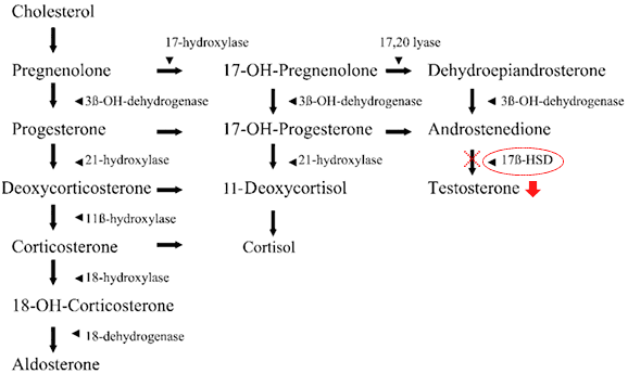 - ความผิดปกติในการสร้างฮอร์โมนเพศชาย เนื่องจากขาดเอนไซม์ที่ใช้ในการสังเคราะห์เทสโทสเทอโรน เช่น 17β-hydroxysteroid dehydrogenase deficiency ทารกจะมีลักษณะ