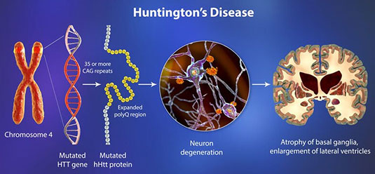 โรคฮันติงตันเป็นโรคทางพันธุกรรมที่ถ่ายทอดแบบ autosomal dominant เกิดจากการขยายซ้ำของ CAG ในยีน HTT ส่งผลให้สมองส่วน basal ganglia เสื่อม และทำให้เกิดอาการเคลื่อนไหวผิดปกติ (โดยเฉพาะ chorea) ร่วมกับความผิดปกติทางอารมณ์และความคิดที่ค่อย ๆ รุนแรงขึ้น การวินิจฉัยยืนยันได้ด้วยการตรวจยีน