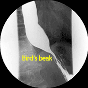 - กลืนแป้ง (Barium swallow): พบลักษณะเฉพาะคือ หลอดอาหารขยายตัวและแคบลงที่ส่วนปลาย คล้าย “bird’s beak appearance”