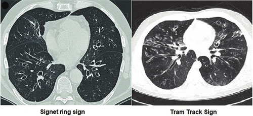 HRCT ไม่มีการขยายหลอดลมแบบ signet-ring sign; มักตอบสนองต่อยาขยายหลอดลมมากกว่า |