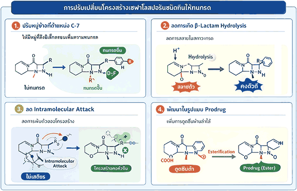 ซึ่งอาจทำให้ยาเกิดการสลายตัวก่อนถูกดูดซึม การพัฒนา oral cephalosporins จึงอาศัยการปรับเปลี่ยนโครงสร้างทางเคมีอย่างมีเป้าหมาย โดยยังคงกลไกการออกฤทธิ์เดิมไว้ ซึ่งปัจจุบันมี 4 วิธีคือ