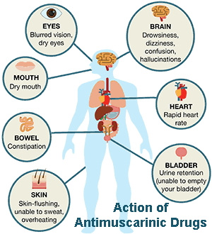 ในกรณีของกระเพาะปัสสาวะ ยาจะลดความถี่และความแรงของการหดตัว ทำให้สามารถเก็บกักปัสสาวะได้มากขึ้น ลดความเร่งด่วนในการปัสสาวะ และลดอาการปัสสาวะเล็ดหรือราดที่เกิดจากการบีบตัวมากเกินไป อย่างไรก็ตาม การออกฤทธิ์ต่ออวัยวะอื่น ๆ ก่อให้เกิดผลข้างเคียงตามมา
