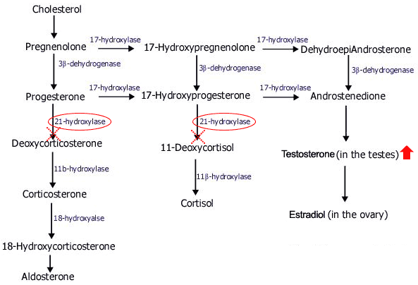 - ความผิดปกติในการสร้างฮอร์โมนเพศชาย เนื่องจากขาดเอนไซม์ที่ใช้ในการสังเคราะห์เทสโทสเทอโรน เช่น 17β-hydroxysteroid dehydrogenase deficiency ทารกจะมีลักษณะ