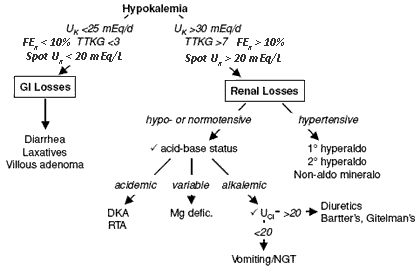 - < 20 mEq/L → น้ำและโซเดียมไม่เพียงพอ ไตจึงไม่สามารถเก็บโพแทสเซียมกลับได้ การสูญเสียโพแทสเซียมจึงมาจากสาเหตุอื่น