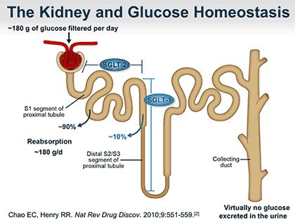 SGLT-2 ซึ่งอยู่ที่ท่อไตส่วนต้น มีหน้าที่ดูดกลับกลูโคสประมาณร้อยละ 90 ส่วน SGLT-1 ซึ่งอยู่ถัดลงไปใกล้ Loop of Henle จะดูดกลับอีกร้อยละ 10 จึงทำให้ในคนปกติไม่พบกลูโคสในปัสสาวะ แต่หากระดับกลูโคสในเลือดเกินประมาณ 200 mg% ปริมาณกลูโคสที่ถูกกรองจะเกินขีดความสามารถของตัวพา จึงเริ่มตรวจพบกลูโคสในปัสสาวะ