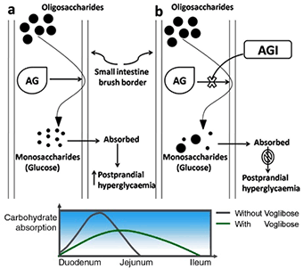 จากภาพจะเห็นว่า หากไม่มีตัวยับยั้งเอนไซม์ (รูป a) ระดับน้ำตาลในเลือดหลังอาหารจะเพิ่มขึ้นอย่างรวดเร็ว แต่เมื่อใช้ยาต้านอัลฟากลูโคสิเดส (AGI) การย่อยคาร์โบไฮเดรตจะช้าลง ทำให้การดูดซึมค่อยเป็นค่อยไป และเลื่อนตำแหน่งการดูดซึมไปถึงลำไส้เล็กส่วนปลาย (รูป b)