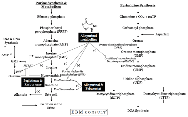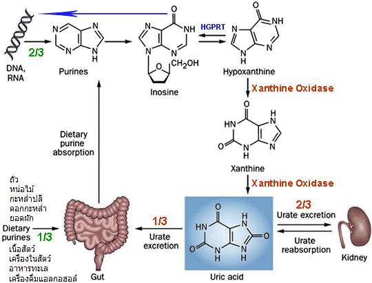 - ยาที่ยับยั้งการสร้างกรดยูริก โดยยับยั้งเอนไซม์ Xanthine oxidase ทำให้ hypoxanthine และ xanthine ไม่ถูกเปลี่ยนเป็นกรดยูริก และสามารถถูกนำกลับไปใช้ในกระบวนการสร้างสารพันธุกรรมผ่านเอนไซม์ HGPRT ตัวอย่างยา ได้แก่ Allopurinol และ Febuxostat