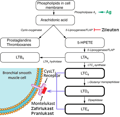 ในปี ค.ศ. 1998 บริษัท Merck ได้พัฒนาและวางจำหน่ายยามอนติลูคาสท์ภายใต้ชื่อการค้า Singulair® ในรูปแบบรับประทาน เพื่อใช้บรรเทาอาการโรคหอบหืด ยานี้ยับยั้งสาร LTD4 ที่ตัวรับ CysLT1 จึงช่วยลดการหดเกร็งของหลอดลมและลดการอักเสบของทางเดินหายใจทั้งส่วนบนและส่วนล่าง ทำให้ใช้ได้ทั้งในโรคภูมิแพ้จมูก โรคหอบหืด และโรคถุงลมโป่งพอง