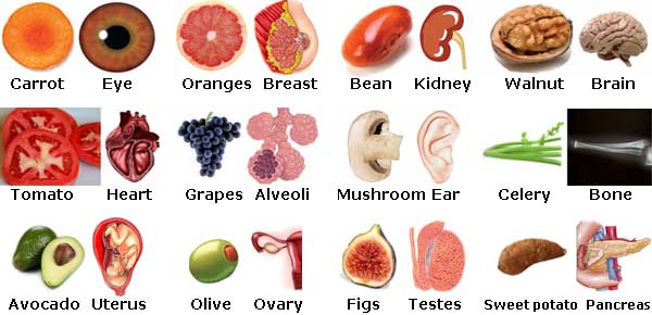 มีข้อสังเกตที่น่าสนใจว่าธรรมชาติมักสร้างสรรค์อาหารที่มีรูปร่างคล้ายอวัยวะของมนุษย์พร้อมคุณประโยชน์ที่สอดคล้องกัน เช่น แครอทที่เมื่อหั่นตามขวางจะคล้ายลูกนัยน์ตา ซึ่งมีเบต้าแคโรทีนช่วยลดความเสื่อมของจอประสาทตา ผลไม้ตระกูลส้มที่มีลักษณะคล้ายต่อมน้ำนมและมีสารไลโมนอยด์ช่วยลดความเสี่ยงมะเร็งเต้านมในงานทดลอง ถั่วที่มีรูปร่างคล้ายไตและอุดมด้วยโพแทสเซียมและแมกนีเซียมช่วยลดการเกิดนิ่วในไต และวอลนัทที่มีลักษณะคล้ายสมองซึ่งช่วยกระตุ้นการสร้างสารสื่อประสาทจำนวนมาก อาหารจากธรรมชาติเหล่านี้ล้วนสะท้อนความสัมพันธ์อันซับซ้อนระหว่างรูปร่าง โครงสร้าง และหน้าที่ของชีวิต