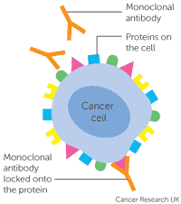 เป็นแอนติบอดีที่ออกฤทธิ์จำเพาะต่อแอนติเจนตำแหน่งใดตำแหน่งหนึ่ง แตกต่างจากโพลีโคลนอลแอนติบอดีที่ได้จากซีรั่มของสัตว์ ซึ่งสามารถจับกับโปรตีนได้หลายตำแหน่งบนแอนติเจนเดียวกัน ยากลุ่มนี้มีชื่อสามัญลงท้ายด้วย “-mab” และถูกนำมาใช้รักษาโรคต่าง ๆ โดยเฉพาะโรคมะเร็ง ตัวอย่างยา ได้แก่