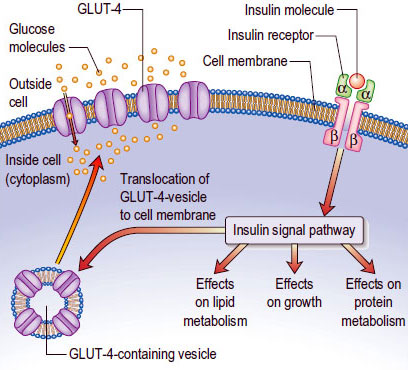 ในเซลล์ไขมัน อินซูลินจะกระตุ้นการสร้างและสะสมเนื้อเยื่อไขมัน ส่วนในเซลล์กล้ามเนื้อจะเพิ่มการสร้างโปรตีนและไกลโคเจน ขณะที่ในเซลล์ตับ อินซูลินจะช่วยให้เกิดการสะสมไกลโคเจนไว้เป็นแหล่งพลังงานสำรองในช่วงที่ร่างกายอดอาหาร เมื่อไกลโคเจนมีปริมาณเพียงพอ กลูโคสส่วนเกินจะถูกตับเปลี่ยนเป็นกรดไขมันอิสระ ไลโปโปรตีน และไตรกลีเซอไรด์ ซึ่งมีลักษณะคล้ายกับกระบวนการในเซลล์ไขมัน แต่เป็นการสะสมไว้ที่ตับ ส่งผลให้เกิดการเพิ่มขึ้นของเนื้อเยื่อไขมันในตับ