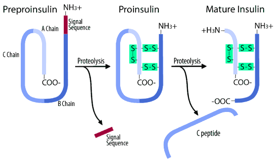 อินซูลินเป็นฮอร์โมนหลักที่ทำหน้าที่ควบคุมสมดุลของกลูโคสในร่างกาย สร้างจากเบตาเซลล์ของตับอ่อน โดยเริ่มต้นจากโปรตีนสายเดี่ยวที่เรียกว่า preproinsulin จากนั้นจะมีการตัดส่วน signal sequence ออก และเกิดการพับตัวของสาย A chain และ B chain เชื่อมกันเป็น proinsulin ก่อนจะถูกตัดสายตรงกลางออก กลายเป็นฮอร์โมนอินซูลินที่พร้อมออกฤทธิ์ ส่วนสายตรงกลางที่ถูกตัดทิ้งเรียกว่า C-peptide ซึ่งจะถูกย่อยสลายในภายหลัง
