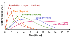 - อินซูลินออกฤทธิ์เร็วมาก (Rapid‑acting insulin) ได้แก่ insulin lispro, insulin aspart และ insulin glulisine เริ่มออกฤทธิ์ภายใน 10–20 นาทีหลังฉีดเข้าใต้ผิวหนัง จึงแนะนำให้ฉีดพร้อมหรือทันทีที่เริ่มรับประทานอาหาร ระยะเวลาออกฤทธิ์ประมาณ 3–5 ชั่วโมง
