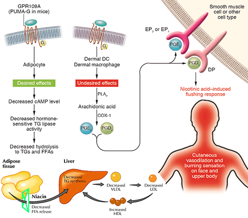 - Glycine pathway โดย glycine จะจับกับไนอาซินกลายเป็น Nicotinuric acid ซึ่งสัมพันธ์กับการเกิดอาการหน้าแดง