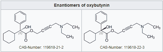 กระบวนการผลิตออกซิบิวไทนินทำให้ได้สารสังเคราะห์ 2 ชนิดที่มีโครงสร้างโมเลกุลเหมือนกันแต่จัดเรียงในรูปสามมิติต่างกัน เป็นภาพสะท้อนกระจกของกันและกัน เรียกว่า R- และ S-enantiomers