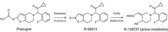 พราซูเกรลเป็นอนุพันธ์ของ Thienopyridine ในรูปแบบ prodrug คือยังไม่ออกฤทธิ์จนกว่าจะผ่านการเมตาบอไลต์ที่ตับโดยเอนไซม์กลุ่ม cytochrome P450 หลังรับประทาน ยาจะถูกดูดซึมอย่างรวดเร็ว และเริ่มออกฤทธิ์ยับยั้งการเกาะกลุ่มของเกล็ดเลือดภายในประมาณ 30 นาที
