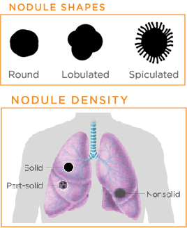 - ความหนาแน่น: ก้อนที่เป็น part-solid หรือ solid มีความเสี่ยงเป็นเนื้อร้ายมากกว่าก้อนที่เป็น non-solid หรือ ground-glass แต่ยังต้องติดตาม