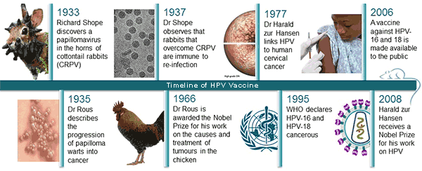 ภายหลัง Dr. Francis Peyton Rous ได้แสดงให้เห็นว่าไวรัส papilloma สามารถก่อให้เกิดมะเร็งในไก่ และได้รับรางวัลโนเบลในปี ค.ศ. 1966 กระทั่ง Dr. Harald zur Hausen เชื่อมโยงการติดเชื้อ HPV กับการเกิดมะเร็งปากมดลูก โดยพบว่า 70% ของมะเร็งปากมดลูกมี HPV สายพันธุ์ 16 และ 18 เป็นสาเหตุ และระบุว่าโปรตีน E6 และ E7 จากไวรัสจะไปยับยั้งยีนกดการแบ่งเซลล์มะเร็ง (p53 และ pRb) ทำให้เกิดเซลล์มะเร็งได้ WHO จึงประกาศในปี 1995 ว่า HPV-16 และ HPV-18 เป็นไวรัสก่อมะเร็ง และ Dr. zur Hausen ได้รับรางวัลโนเบลจากงานวิจัยนี้