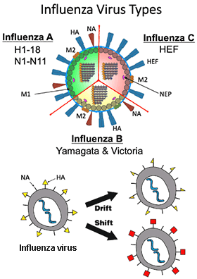 ไวรัสที่ก่อโรคในคนมี 3 ชนิดหลัก คือ Influenza A, B และ C โดย A และ B มีโปรตีน hemagglutinin (HA) และ neuraminidase (NA) บนผิวไวรัส ส่วนชนิด C มีเพียงโปรตีน HEF จึงก่อโรคได้ไม่รุนแรง